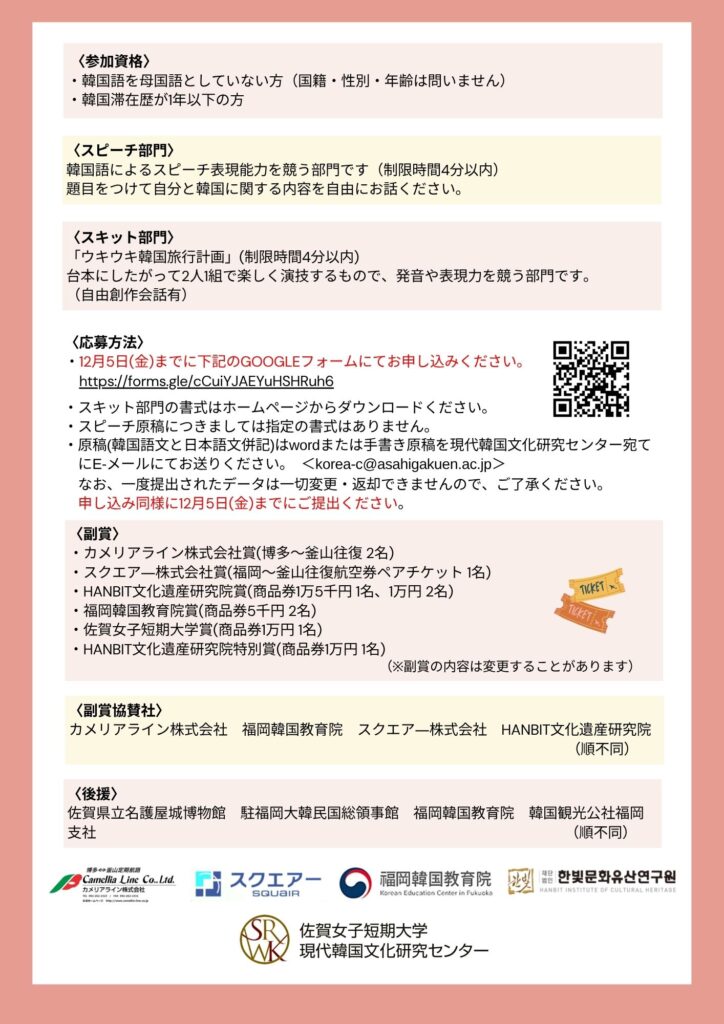 締切りまでに応募用紙をご記入の上、メールで korea-c@asahigakuen.ac.jp 宛に添付してお送りください。「スキット部門」の「自由創作会話」部分と「スピーチ部門」の原稿は、それぞれ韓国語と日本語訳を合わせて、氏名・連絡先を記入の上、12月5日(金)までにお送りください。