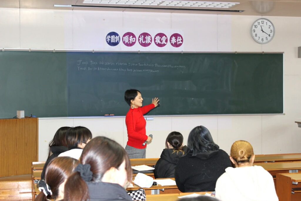 学生の発表は、多文化社会で、歌や音楽を入り口に、言語や習慣の壁を超える人間力、共感力を身に着けることを目標に行われてきたこの授業の集大成です。
